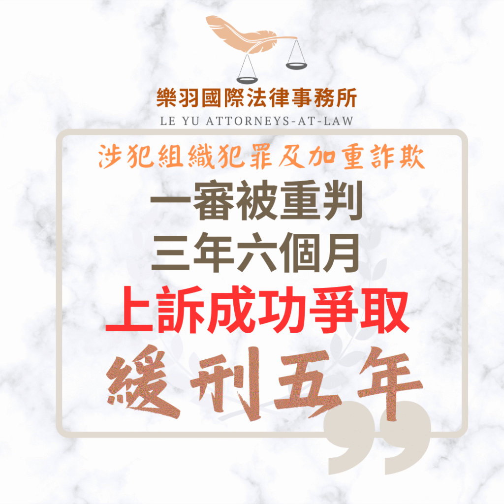 但在二審委任樂羽國際法律事務所辯護後,最終成功獲得 緩刑五年,避免入監執行,為當事人爭取到最有利的結果。