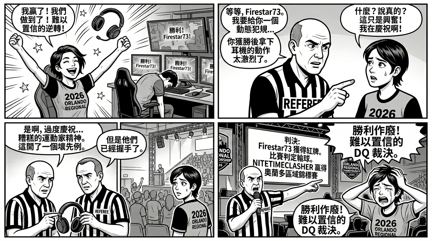 在美國佛羅里達州舉辦的一場「2026 奧蘭多區域錦標賽」(Orlando Regional Championship)爆發史無前例的判決爭議。原本自敗組一路逆襲奪冠的選手 Firestar73,在勝負底定後因情緒激動「摘下耳機」動作過大,竟然遭現場裁判認定「違反運動家精神」,當場改判該局落敗,導致痛失到手的冠軍頭銜。