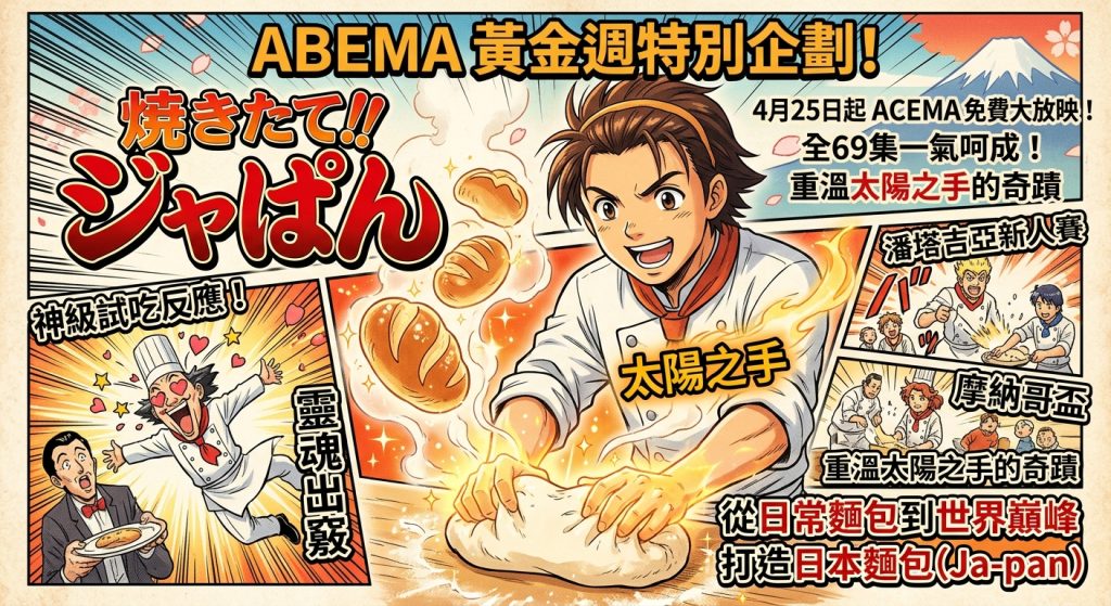 還記得那隻神奇的「太陽之手」和讓人看到靈魂出竅的試吃反應嗎?為了迎接即將到來的日本黃金週,影音平台 ABEMA 宣布自 4 月 25 日起舉辦「黃金週動畫免費大放映」活動。其中最受矚目的,莫過於首度在該平台播出的經典美食競技動畫——《烘焙王(焼きたて!!ジャぱん)》,屆時將一口氣播完包含「潘塔吉亞新人賽」與「摩納哥盃」在內的全 69 集內容。