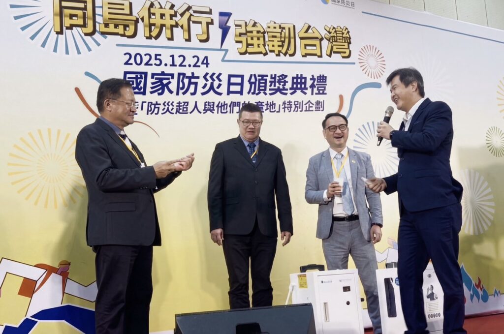 為強化全民防災意識並展現臺灣防災產業專業量能,內政部消防署今(24)日舉辦「2025 國家防災日頒獎典禮」。活動聚焦防災技術與實務應用成果,現場展出多項應變設備,其中創淨科技(ELECLEAN)展出免電力淨水箱與消毒箱,透過手壓即可製作飲用水、手搖即可生成消毒水,行政院副秘書長阮昭雄親自示範後更幽默取名「手搖飲」,成為現場矚目的防災亮點