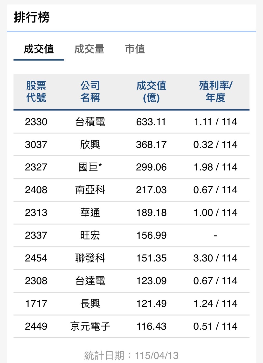 上週4 月 10 日全體上市公司市場總值為新台幣 115 兆 5,589.94 億元,較前一週(115 年 4 月 2 日)市值 106 兆 2,966.75 億元增加 9 兆 2,623.19 億元,增幅約為 8.71%。