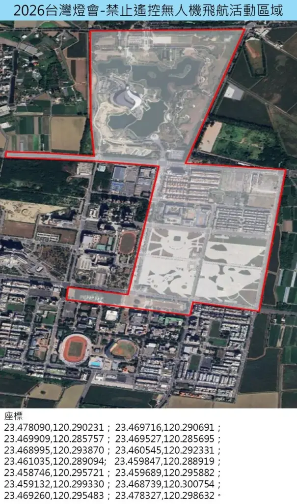 2026台灣燈會將於3月3日至3月15日在嘉義縣盛大登場,相信有許多空拍機玩家已迫不及待,考量活動期間人潮眾多,基於維安及民眾參與活動安全考量,縣府建設處已於會場周邊劃設遙控無人機飛行管制區域與時間,請民眾遵守相關規範。
