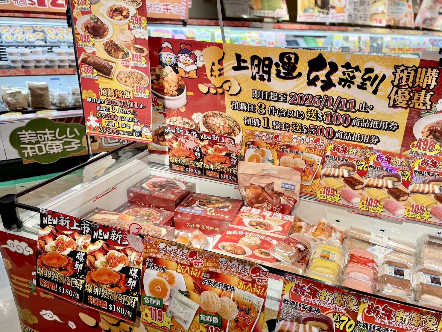 春節腳步將近,年菜市場提前暖身。DON DON DONKI大立店因應過年需求,推出「馬上開運好菜到」中式年菜組合,主打一次備齊的便利性。年菜套組共9道菜色,包含宮廷鮑魚佛跳牆、干貝櫻花蝦米糕及富貴金絲元蹄等應景料理,預購整組另贈500元DON DON DONKI商品抵用券,優惠至1月11日止。除套組外,亦開放單道菜色於現場逐一選購,讓小家庭或用餐人數較少的消費者,能依實際需求彈性搭配年菜內容。