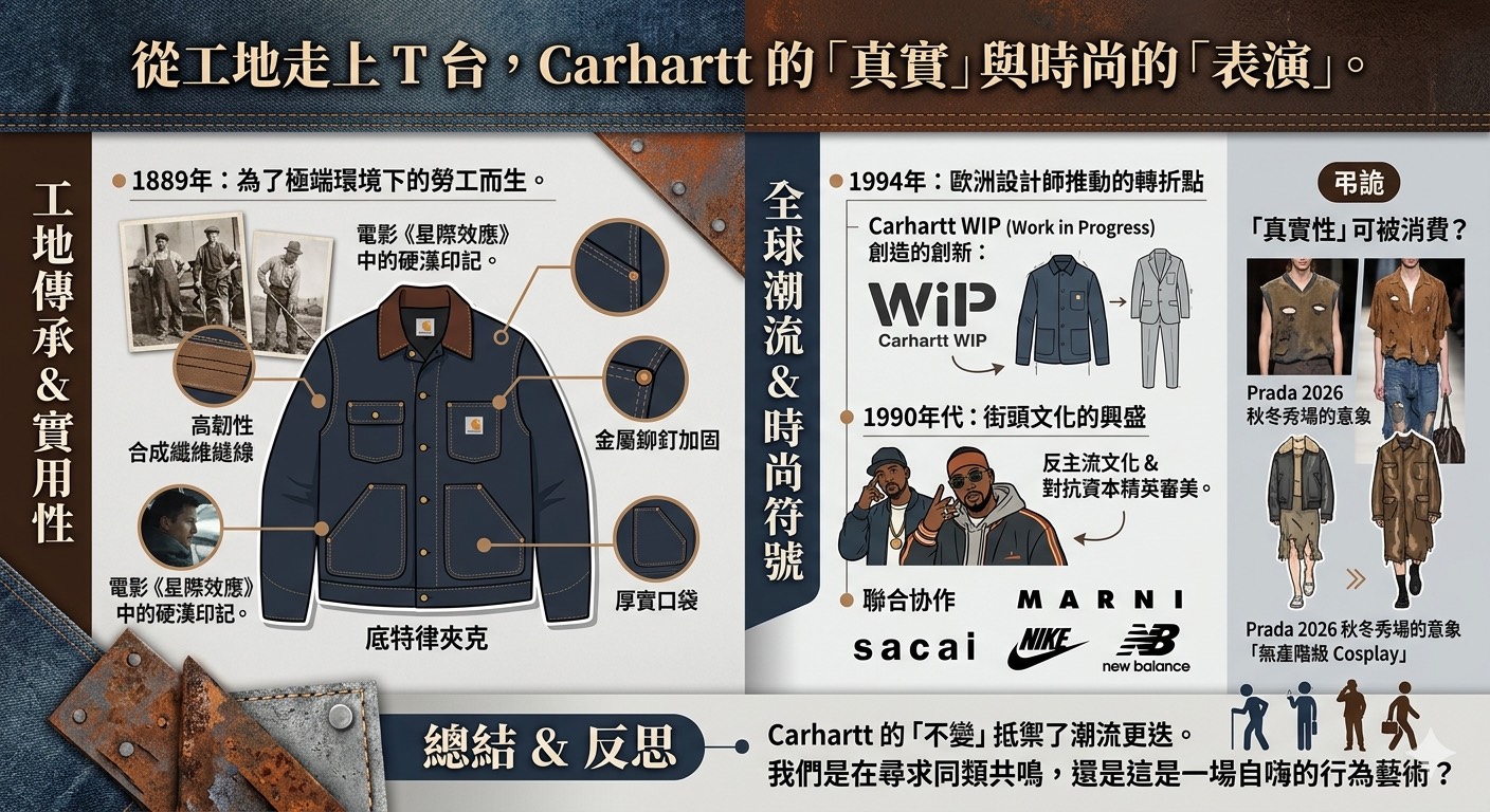 當我們在巴黎時裝週的場外,看見 Louis Vuitton 的創意總監 Pharrell Williams 穿著一件磨損的工裝夾克,搭配價值百萬的鱷魚皮手袋時,時尚圈的邊界似乎再次模糊了。這件看似普通、充滿勞動痕跡的衣服,正是來自擁有百年歷史的美國品牌——Carhartt。一個原本為藍領工人服務的耐用制服品牌,為何能在當今成為潮流殿堂的常客?這背後不僅僅是版型的演變,更是一場關於「真實性」的社會文化辯論。