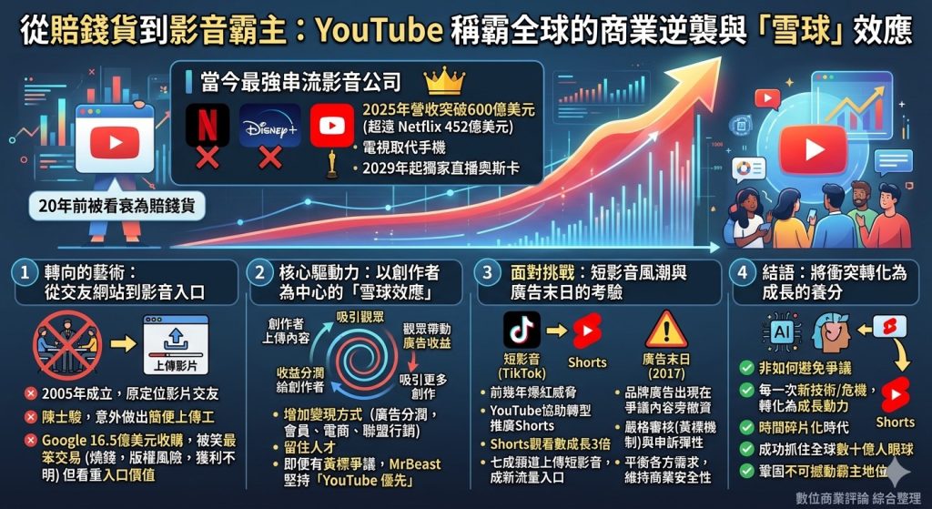 從一個差點失敗的交友網站,到如今威脅所有影視產業的影音霸主,YouTube 給商業世界最重要的一課,並非如何避免爭議,而是在每一次面臨新技術(如 AI、短影音)或新危機時,如何將可能擊垮自己的衝突轉化為下一輪成長的動力。在這個時間碎片化的時代,YouTube 依然成功地抓住了全球數十億人的眼球,鞏固其不可撼動的霸主地位。