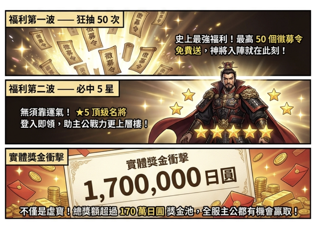 本次週年慶最大的亮點在於極其豐厚的登入獎勵。官方表示,活動期間玩家最高可獲得多達 50 個「徵募令」,大大提升招募強大戰力的機會。此外,更將直接免費發放隨機「★5 名將」,讓所有主公都能在戰場上如虎添翼,輕鬆強化軍隊陣容。