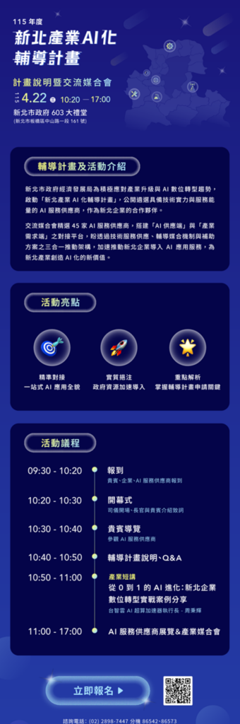 【記者葉柏成/新北報導】面對全球產業升級與數位轉型浪潮,新北市政府積極協助企業導入人工智慧(AI)技術,將於4月22日舉辦「115年度新北產業AI化輔導計畫說明暨交流媒合會」,集結45家優質AI服務供應商,展示多元應用解決方案,並採預約制進行精準媒合,協助企業加速升級、提升競爭力,搶占智慧轉型先機。