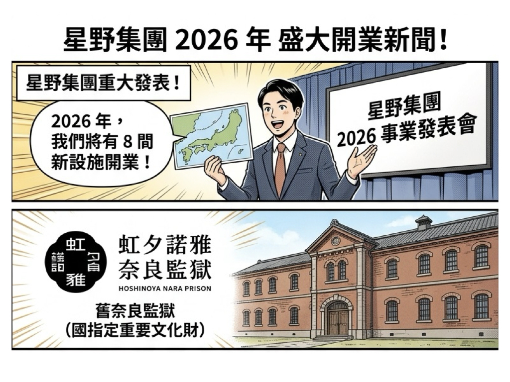 星野集團宣布 2026 年將有 8 間新設施開業,其中最受矚目的「虹夕諾雅 奈良監獄」定於 6 月 25 日正式迎客。該計畫成功活化日本國家重要文化財「舊奈良監獄」,將百年前的磚造舍房改建為 48 間頂級套房,包含打通 10 間獨居房而成的「The 10-Cell」房型,讓旅客在奢華氛圍中親觸歷史紅磚。每房每晚售價 14.7 萬日圓(含稅)起,實現古蹟保存與旅遊價值的完美融合。