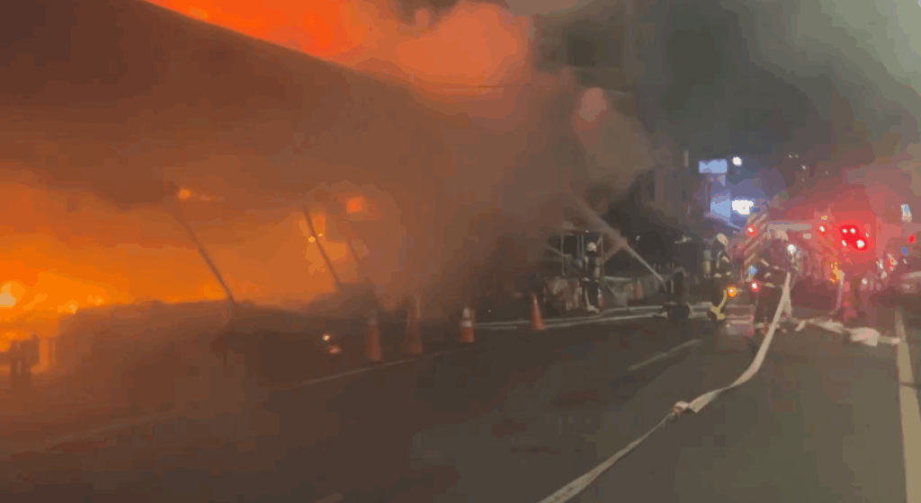 【警政時報 崔兆慧/桃園報導】桃園區南門市場今(5)日晚間發生火警,消防局於晚間9時35分接獲民眾報案,指稱位於桃園區文化街65號對面之南門市場攤販起火,現場濃煙竄天,火勢一度猛烈,消防局隨即出動大批人車搶救,並於9時41分抵達現場,火勢升為二級火警。