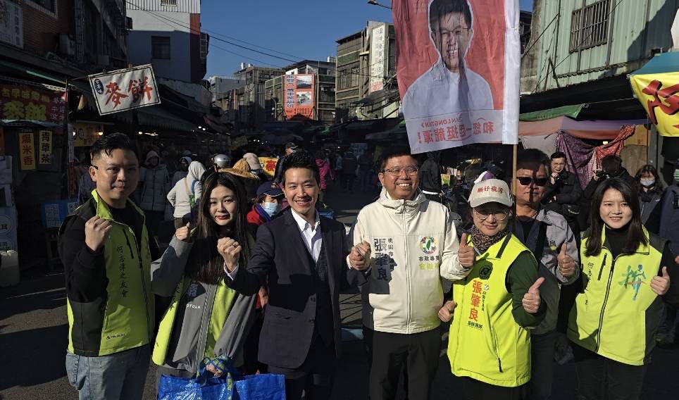 總統府副秘書長何志偉10日前往桃園市龍潭市場,陪爭取連任的市議員張肇良掃街,下午與市議員劉仁照、王珮毓出席親子活動同框,展現「母雞效應」。圖/民眾提供