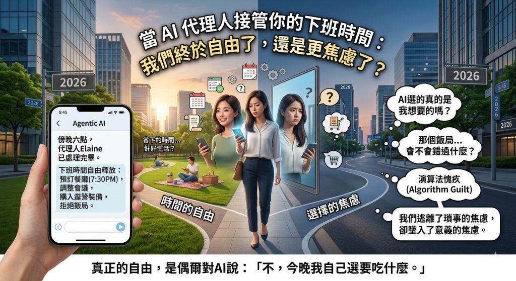 聽起來很美好,對吧?2026年的此刻,Agentic AI(自主代理人)已不再是科幻概念。它能獨立執行跨系統的複雜任務:比價、協商、下單、排程,甚至代你拒絕邀約。理論上,我們的下班時間終於從瑣碎的「生活行政」中解放了——不再需要花四十分鐘比價訂房,不用在五個群組裡喬聚餐時間。