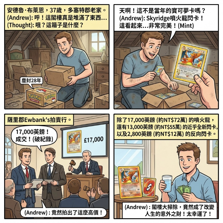 一名美國男子的「閣樓大掃除」演變成了一場改變人生的意外之財。現年 37 歲的教學助理安德魯·布萊恩(Andrew Braund),日前在清理父母位於多塞特郡(Dorset)老家的閣樓時,翻出了塵封 28 年的寶可夢(Pokémon)卡牌收藏。這批原以為僅值幾百英鎊的小玩意,最終於本週四在拍賣會上以驚人的 32,800 英鎊(約新台幣 139 萬元) 總價成交,成功解決了他的婚禮預算。