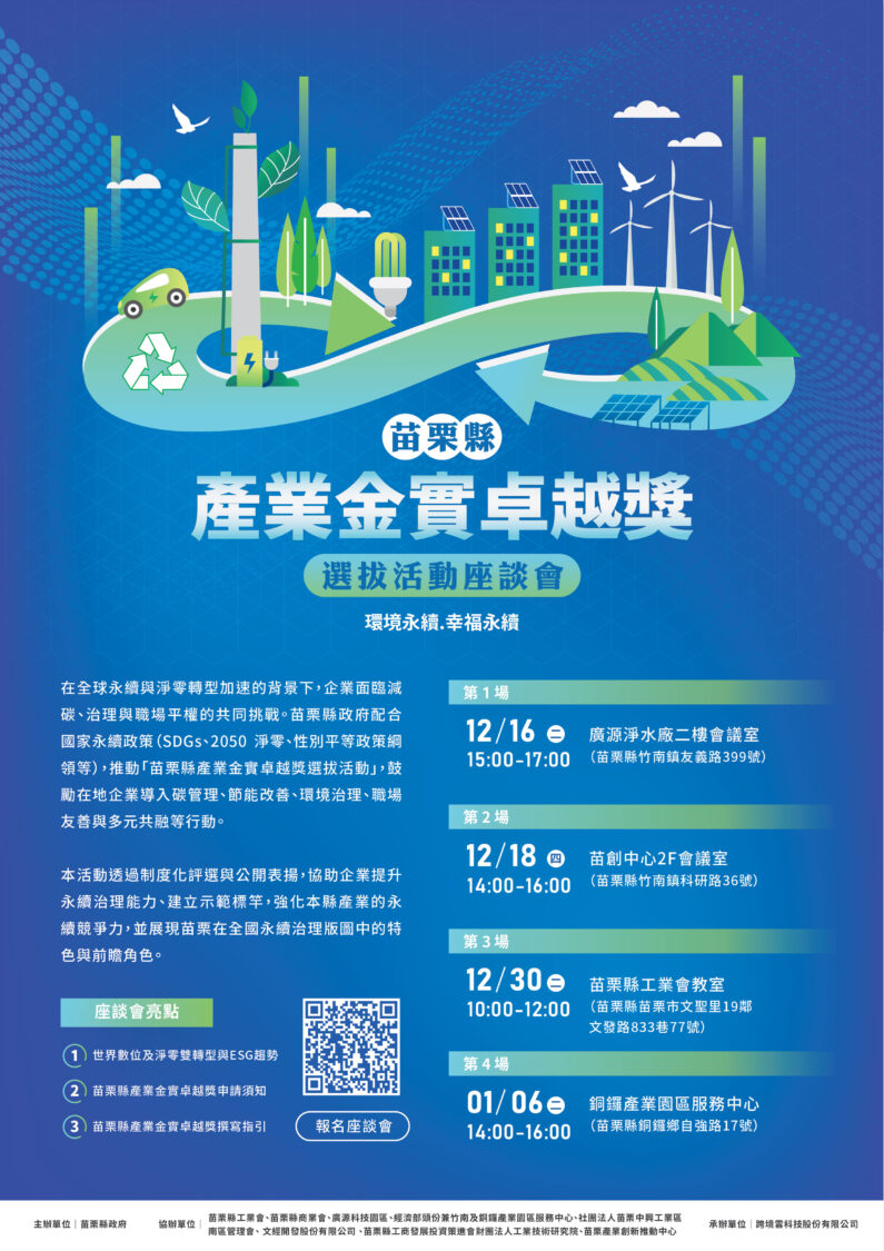 苗栗縣政府指出,隨著聯合國永續發展目標(SDGs)及我國《氣候變遷因應法》上路,2050 淨零排放已成為國家級發展目標,產業在碳管理、能源轉型、治理制度與人才留任等面向,皆面臨實質挑戰。尤其苗栗縣以科技與製造業為主,企業若能及早布局 ESG 與低碳轉型,將有助於提升供應鏈競爭力與市場信任度。