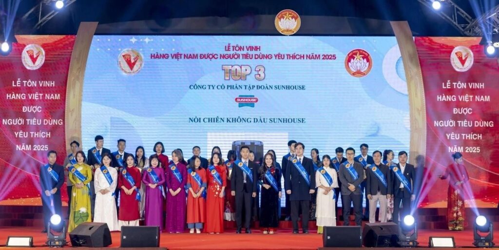 SUNHOUSE 團隊在「2025 越南消費者喜愛國貨」表彰典禮上登台領獎,其「SUNHOUSE 無油氣炸鍋」獲選 Top 3,成為越南在地家電品牌強調自製與品質控管的代表案例。(圖片來源:Thanh Niên/越南青年報)