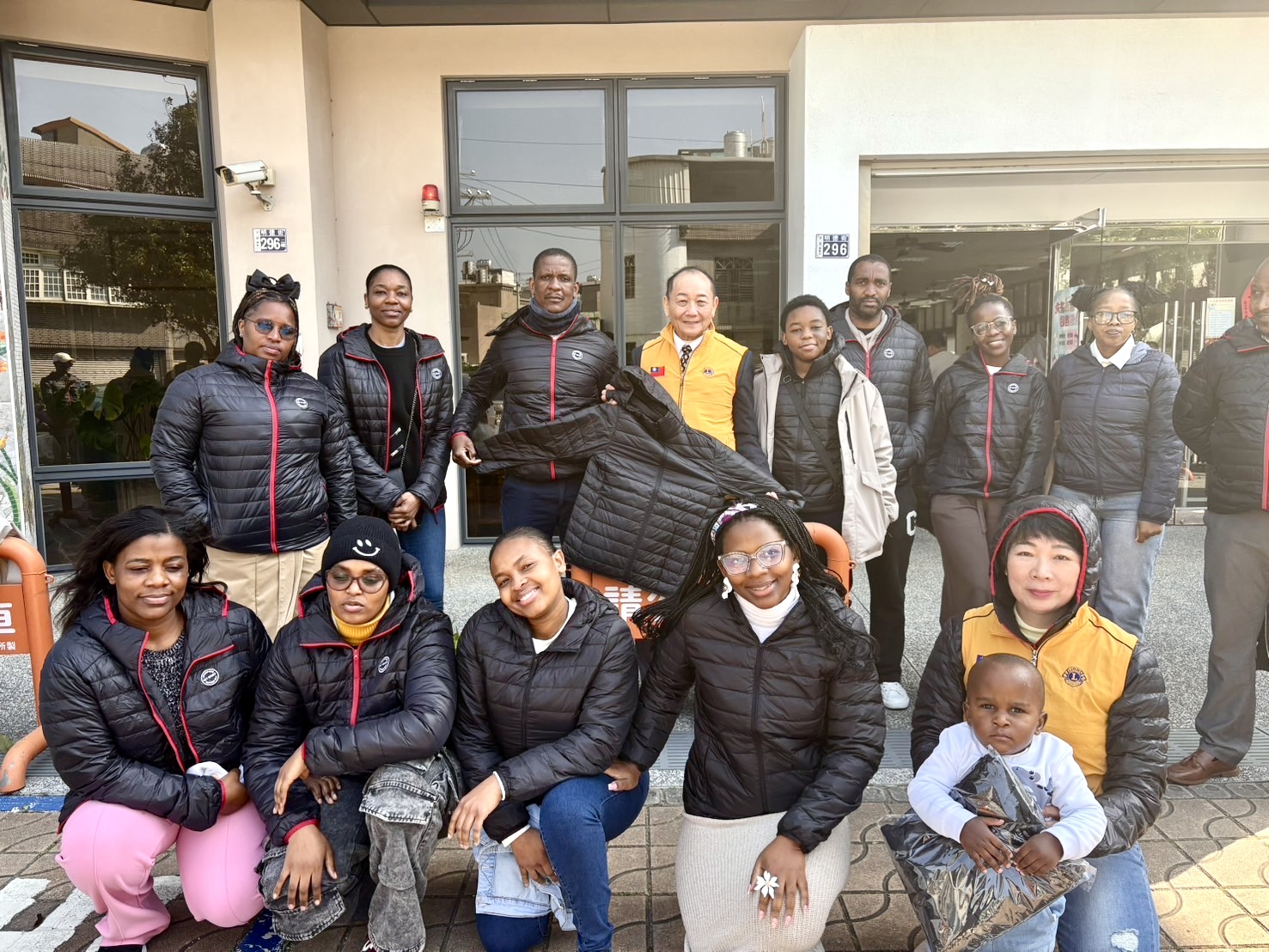 美仁食品有限公司董事長陳美仁與來自史瓦帝尼王國的青年朋友合影留念,活動中捐贈羽絨外套,協助友邦朋友適應台灣冬季濕冷氣候。(圖/記者林照東攝)