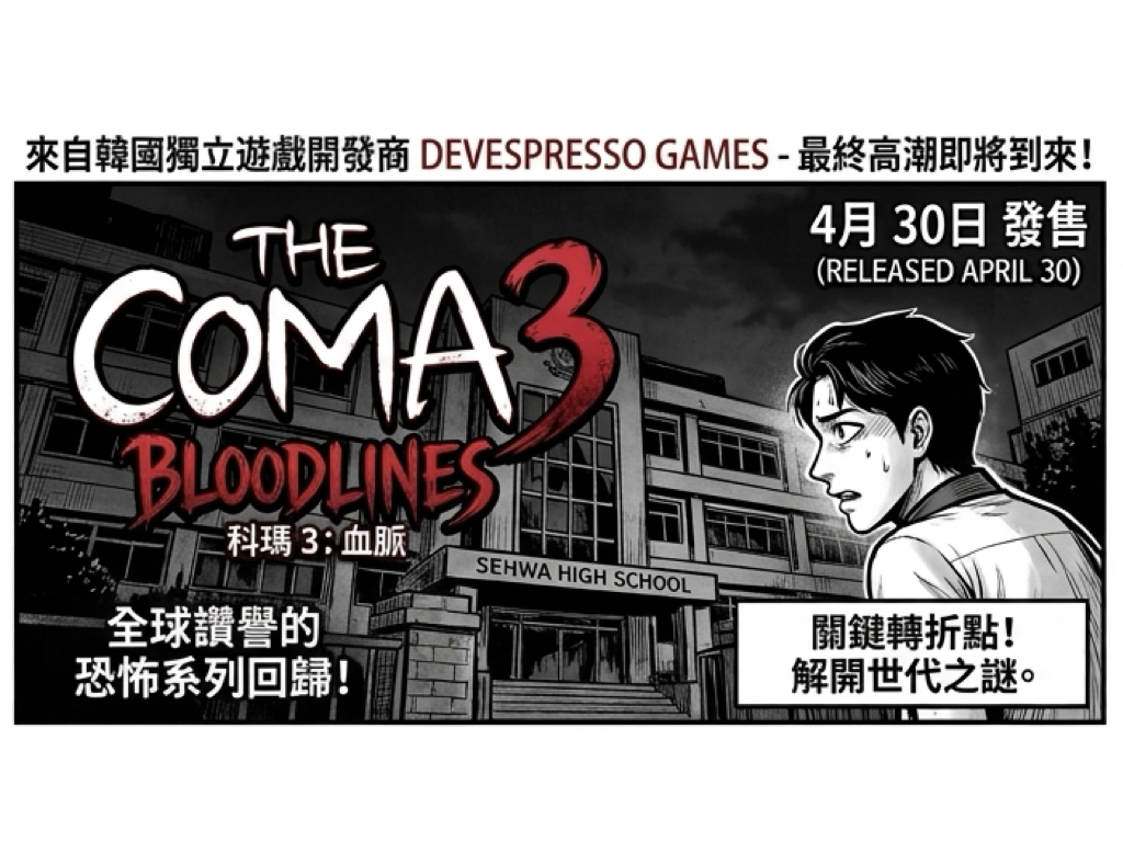 韓國獨立開發團隊 Devespresso Games 打造的《昏迷(The Coma)》系列,廣受全球恐怖遊戲玩家好評,現正式宣布其最新續作《昏迷 3:血脈》(The Coma 3: Bloodlines)於 4 月 30 日發售。作為系列的關鍵轉點,本作品不僅延續了標誌性的手繪漫畫風與窒息的追逐戰,更承諾將解開自初代作品以來埋藏多年的核心謎團。