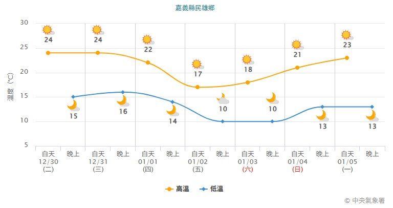 首波強烈大陸冷氣團南下 嘉義縣政府提醒農漁業做好防寒措施根據中央氣象署預報,強烈大陸冷氣團南下,預計1月2日白天至4日清晨各地天氣寒冷,嘉義平地低溫預測下探10度,嘉義縣政府籲請農漁牧養殖業及山坡地作物,應及早加強防寒措施,避免農作物、養畜禽及水產物受害而造成損失。