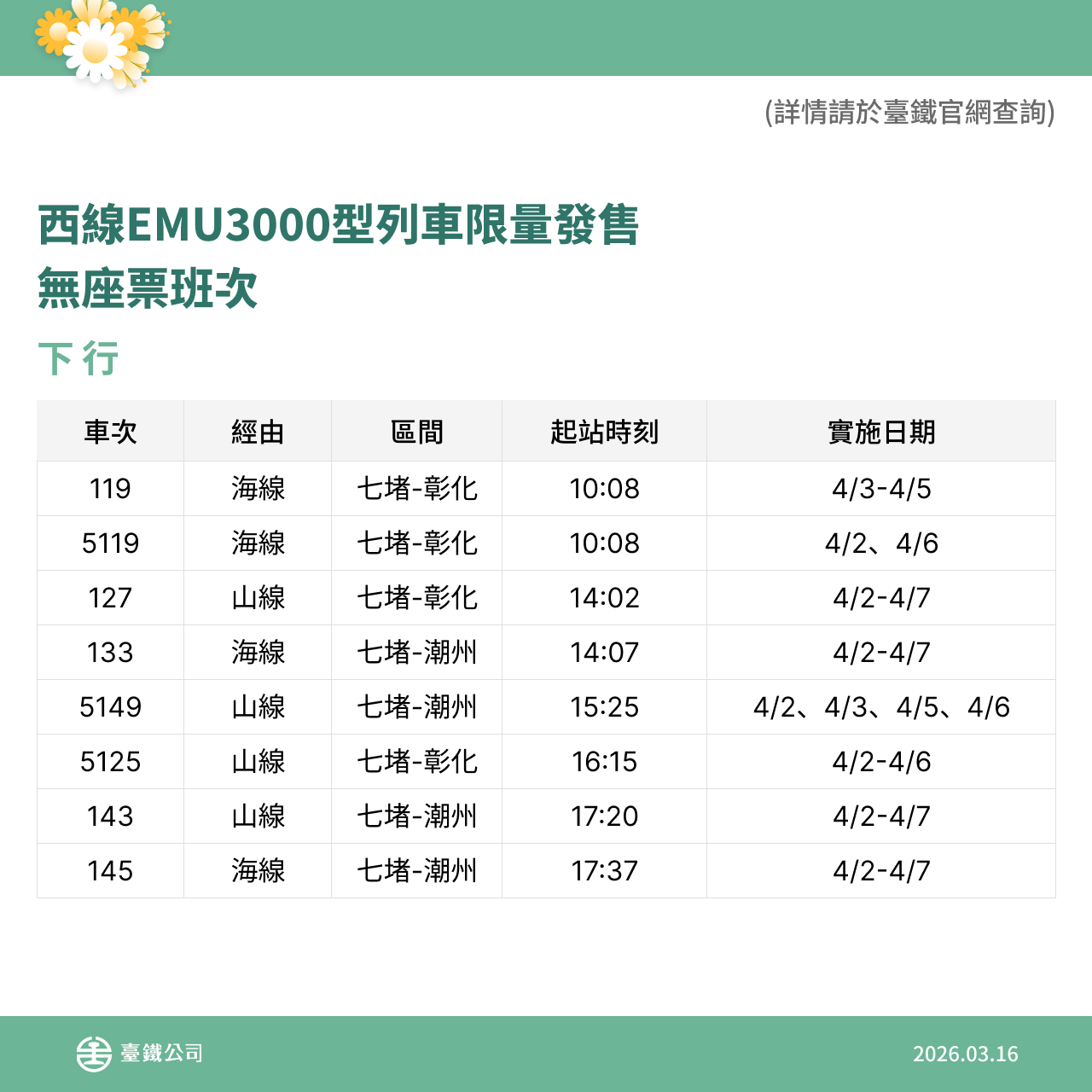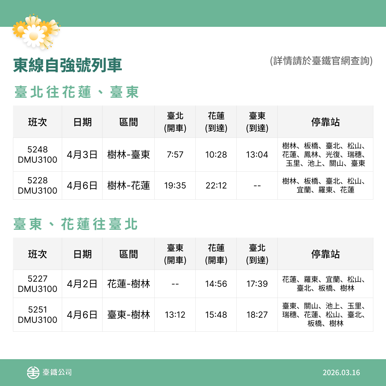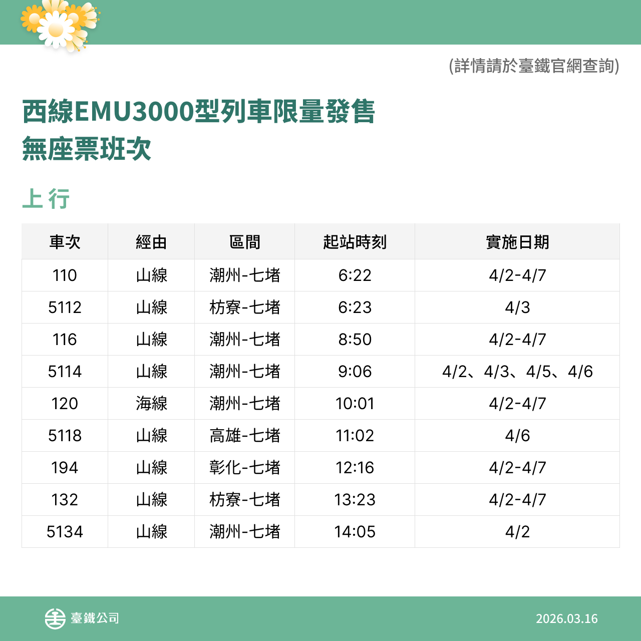 本次再加開班次自115年3月18日(三)零時起同步開放網路、台鐵e訂通、超商及電話語音訂票,歡迎旅客多加利用。相關加開列車車次、時刻,即日起可於臺鐵公司官網及「台鐵e訂通」APP查詢。