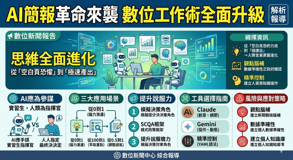 整體而言,AI簡報的核心並非完全自動化,而是「策略性對齊」。透過清晰的工作流程與人機協作機制,AI可大幅節省約70%的製作時間,但最終成敗仍取決於使用者對內容的洞察與決策能力。在數位競爭日益激烈的當下,掌握AI簡報術已成為職場不可或缺的關鍵能力。