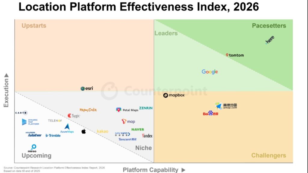 根據 Counterpoint Research 最新發佈的《2026年地理位置平台效能指數》(Location Platform Effectiveness Index),地理位置服務正從傳統的導航地圖,轉型為由人工智慧(AI)驅動的數據平台。報告指出,HERE 與 TomTom 在全球競爭中脫穎而出,成為僅有的兩家被評為「領航者」(Pacesetters)的廠商;Google 則被評為「領導者」(Leaders)。