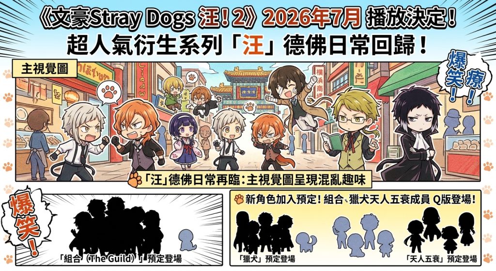廣大漫迷引頸期盼的超人氣異能戰鬥作品衍生系列—《文豪Stray Dogs 汪!(Bungo Stray Dogs Wan!)》正式宣布,動畫第二季《文豪Stray Dogs 汪!2》將於 2026 年 7 月 起正式播放!官方於今日同步揭曉了充滿「汪」德佛氛圍的主視覺圖,並釋出首波角色登場情報。